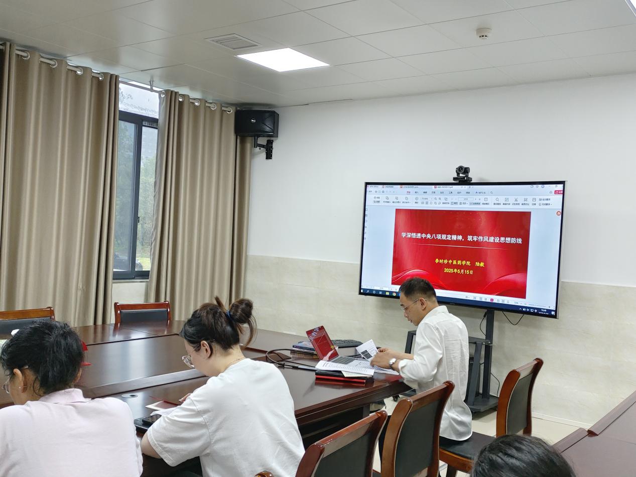 2025年5月15日下午16:30在李时珍中医药学院101会议室,中药学教研室教工党支部举行了主题为“扎实开展警示教育,切实改进工作作风”的主题党日活动,由支部书记陆毅主持。