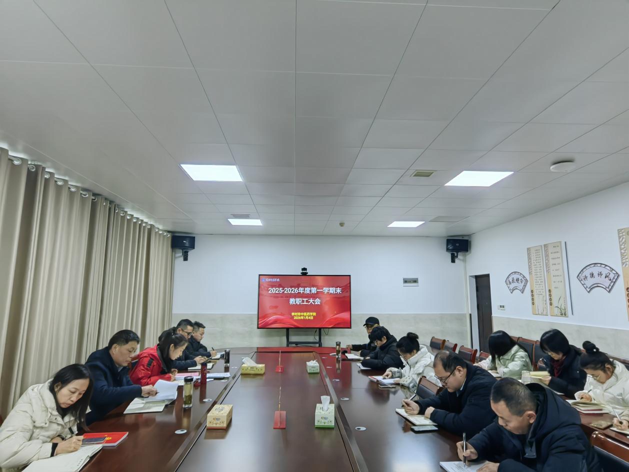 1月4日,李时珍中医药学院在学院101会议室召开2025-2026年度第一学期末教职工大会,全面传达学校有关文件精神,系统部署期末各项重点工作,并对学院年度核心任务进行再动员、再强调。院党总支书记李争婕、院长何峰、副院长张万举、王书珍、谭爱华出席会议。会议由院长何峰主持。